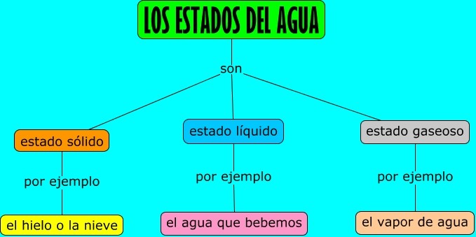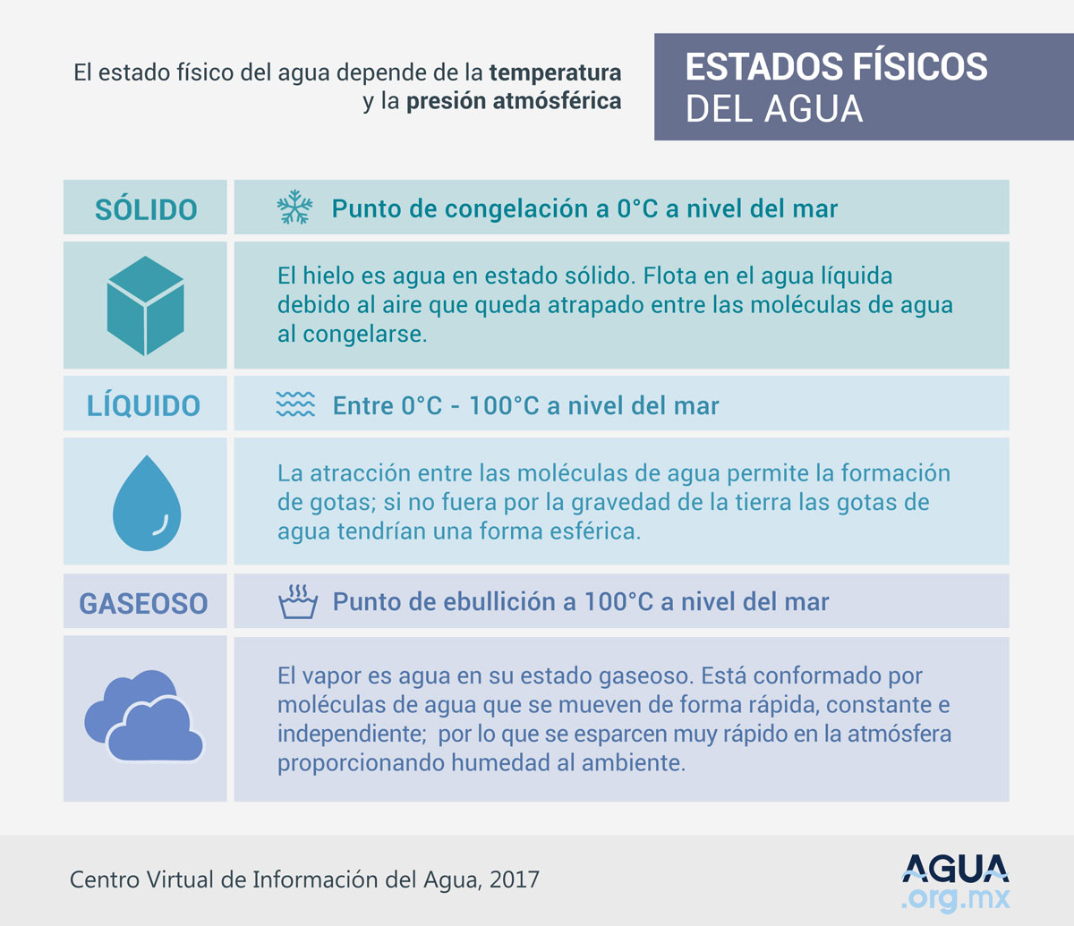 El agua en estado líquido es la que bebemos, la que encontramos en los ríos, en los mares y océanos, en los lagos, en las fuentes, en los acuíferos (aguas subterráneas), la que sale del grifo, etc..